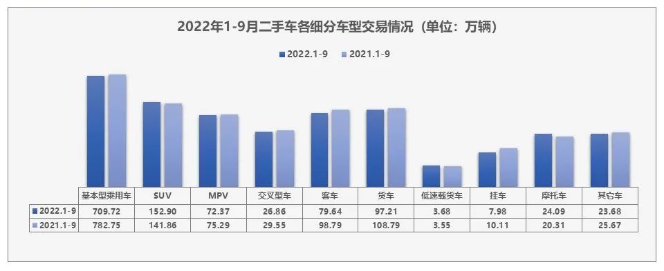 2022年1-9月,全国二手车市场累计交易量1198.12万辆,同比下降7.6%。基本型乘用车共交易709.72万辆,同比下降9.3%;SUV 共交易152.9万辆,同比增长7.8%;MPV共交易72.37万辆,同比下降3.9%;交叉型乘用车共交易26.86万辆,同比下降9.1%。