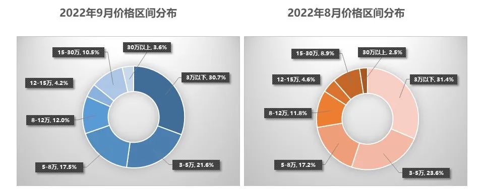 9月份,5-8万、8-12万、15-30万和30万以上区间交易量占比小幅增加,其他价格区间交易量占比有所减少。