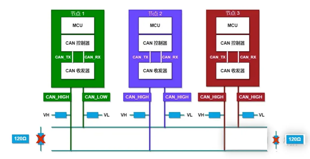 CAN总线支持多个节点挂载在总线上,具体如下图所示;